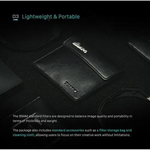 This 1-stop, 95mm Illusion Full-Spectrum ND Filter from Tilta is a waterproof, oil-resistant, and scratch-resistant nano-coated filter designed for the circular 95mm standard of the Tilta Mirage matte box. As a full-spectrum ND filter, it evenly reduces all wavelengths of light, including visible, ultraviolet, and infrared light. The filter is built to uniformly reduce the levels in the light spectrum without significantly affecting the color. The overall spectral curve remains consistent, and light intensity for various colors is proportionally diminished and does not result in color bias.